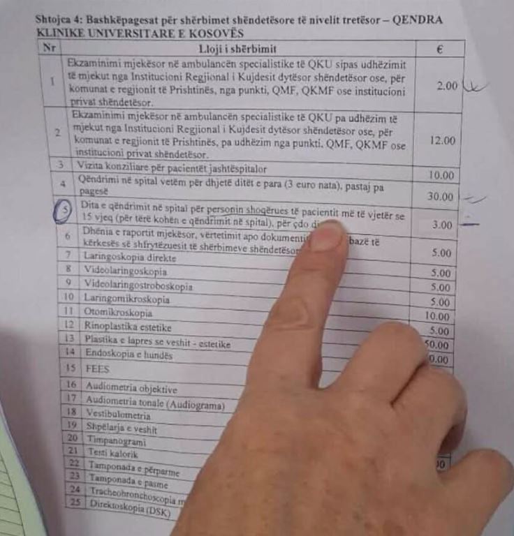 Familjarët që qëndrojnë pranë pacientëve në Klinikën Qendrore Universitare të Kosovës (QKUK) tani duhet të paguajnë 3 euro për çdo 24 orë qëndrimi, pavarësisht moshës apo statusit financiar.