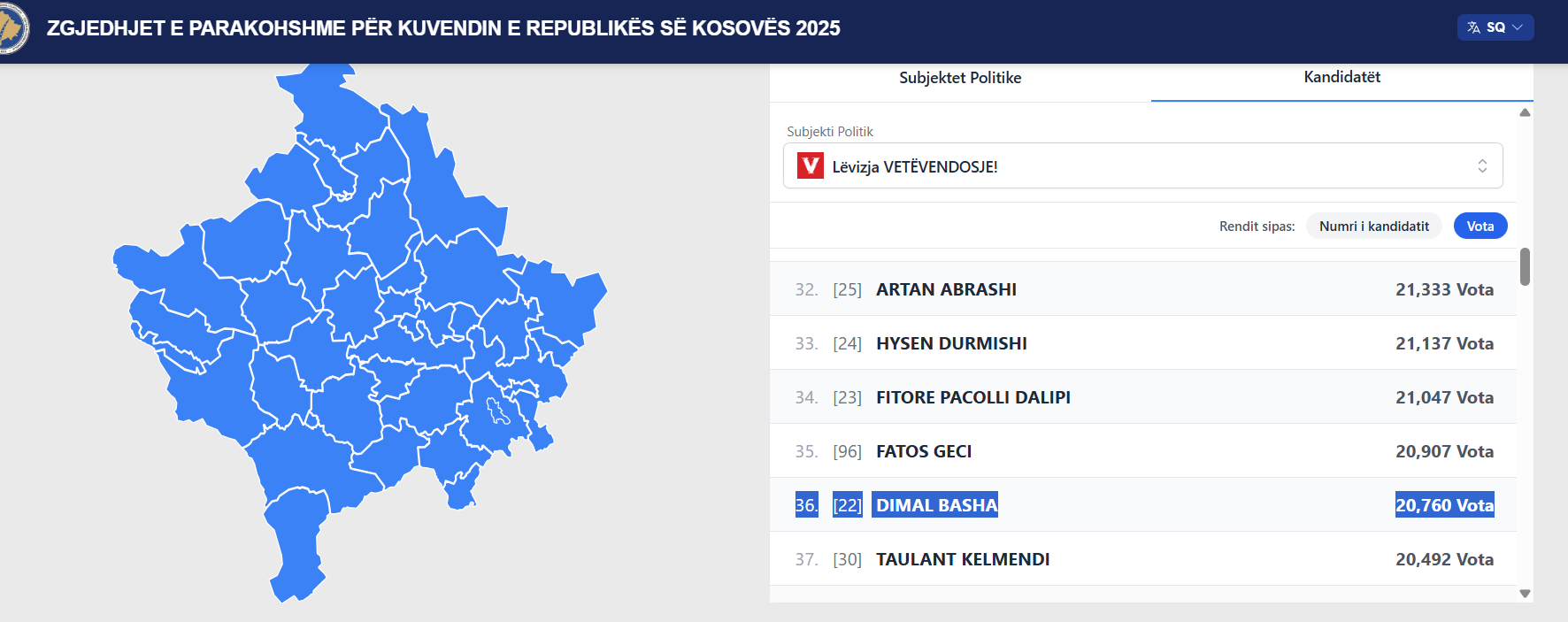 Dimal Basha ishte i 26-ti në listën e më të votuarve të Vetëvendosjes në zgjedhjet e rregullta të 9 shkurtit 2025. Tani është disa vende më poshtë.Çka ndodhi?