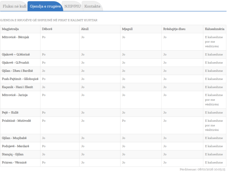Sipas përditësimit të fundit, të gjitha rrugët janë të kalueshme, përveç Mitrovicë- Bërnjak, Mitrovicë- Jarinjë, Prishtinë- Mutivodë janë të kalueshme por me vështirësi.