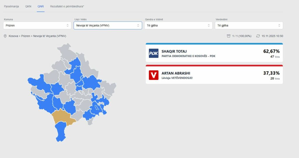 Artan Abrashi i VV-së prin në votat me kusht, i cili ka siguruar 59.06% të tyre, derisa kryetari aktual, Shaqir Totaj ka marrë 40.94% të votave, transmeton Klankosova.tv.