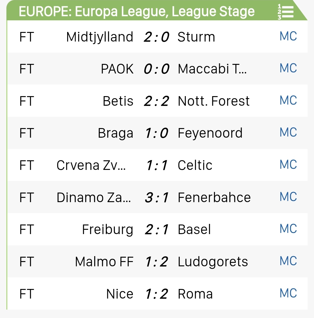 Ne ndeshjet e tjera, Paok barazoi me Maccabi Tel Aviv, ashtu si edhe Zvezda me Celtic dhe Betis me Nottingham Forest. Fitore e Dinamo Zagreb, Bragës, Midtjylland, Freiburg dhe Ludogorets.