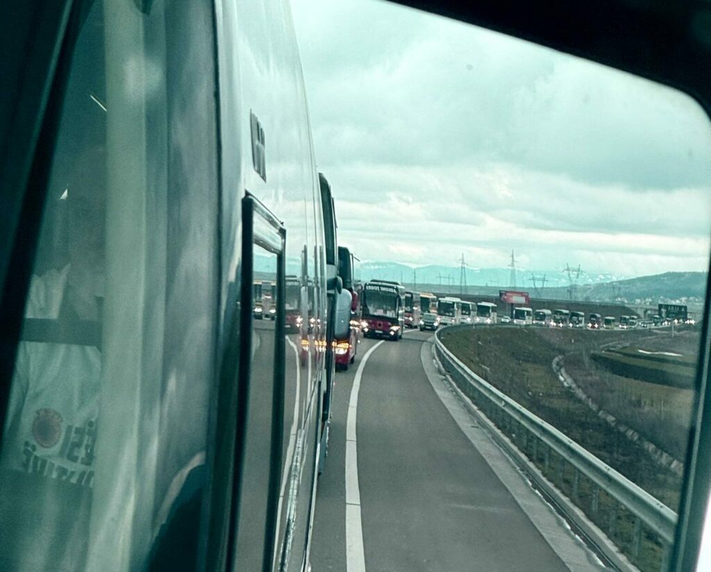 Kryetari i Ferizajit, Agim Aliu ka ndarë pamje ku shihen autobusë të shumtë që janë nisur drejt Prishtinës ku do të mbahet marshi në përkrahje të ish-krerëve të UÇK-së që po gjykohen në Hagë.