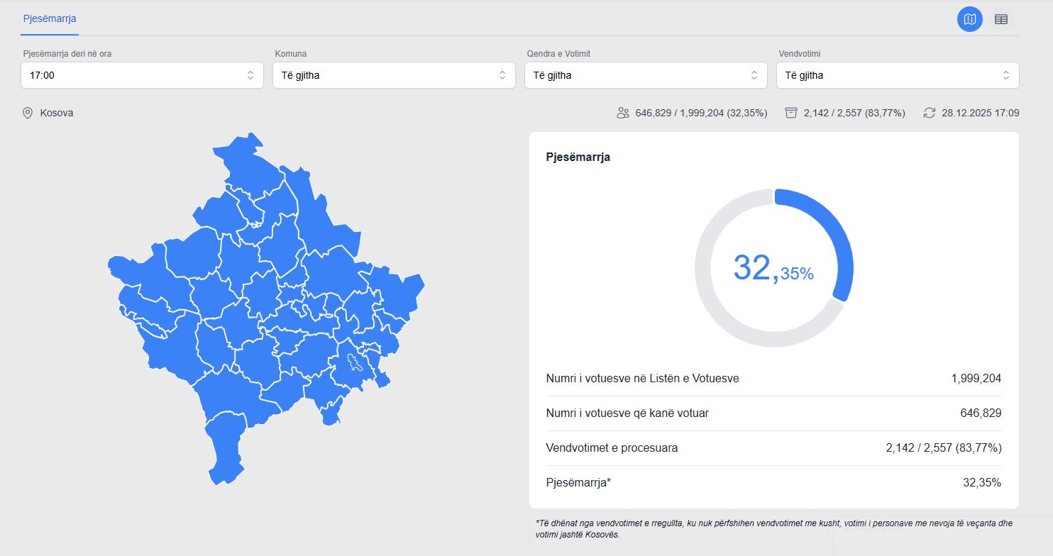 Në përqindje, pjesëmarrja e deritanishme në procesin zgjedhor është 32.35%, transmeton Klankosova.tv.