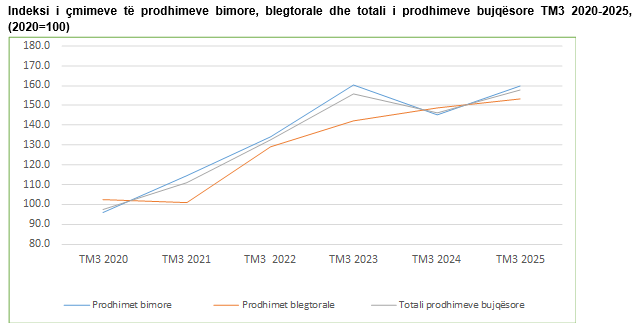 “Në TM3 2025, indeksi i çmimeve të prodhimeve bimore ka rritje për 9.9 për qind, krahasuar me periudhën e njëjtë të vitit 2024. Indeksi i çmimeve të prodhimeve blegtorale ka rritje për 3  për qind, krahasuar me periudhën e njëjtë të vitit 2024”, thuhet në raportin e ASK-së.