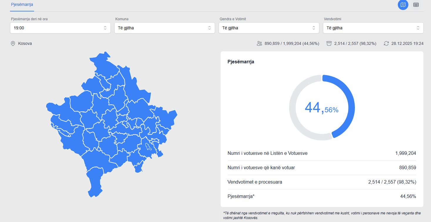 Komisioni Qendror i Zgjedhjeve në përditësimin e fundit, ka bërë të ditur se pjesëmarrja e qytetarëve në zgjedhjet e 28 dhjetorit është 44.56%.