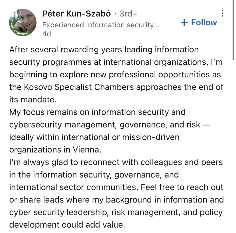 “Pas disa vitesh të kënaqshme duke drejtuar programe të sigurisë së informacionit në organizata ndërkombëtare, po filloj të eksploroj mundësi të reja profesionale ndërsa Dhomat e Specializuara të Kosovës i afrohen fundit të mandatit të tyre”, ka shkruar ndër të tjera Peter Kun Szabo.
