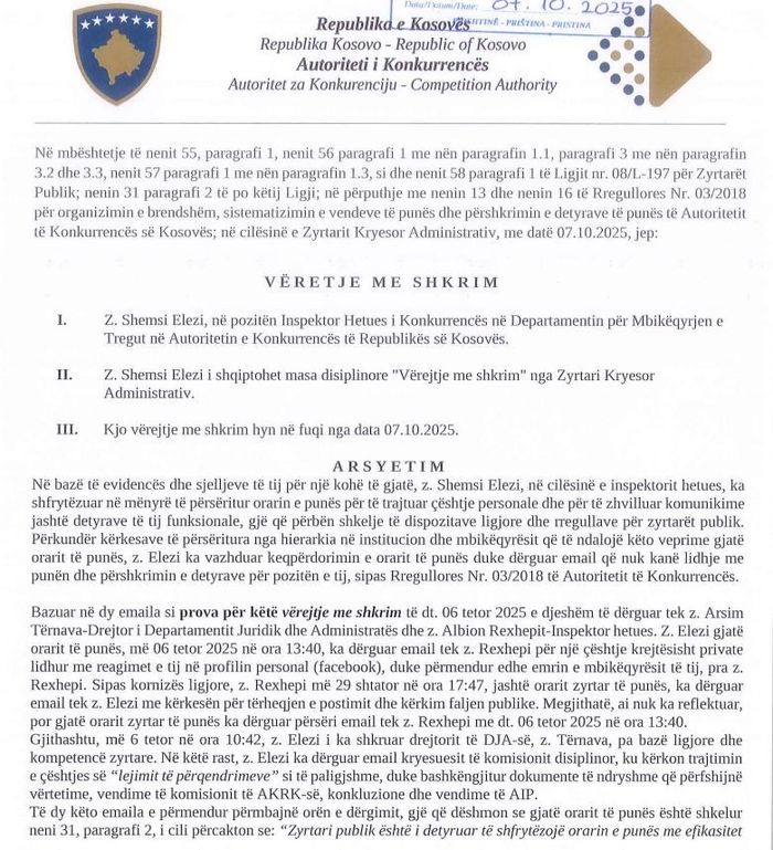 Shkeljet që i atribuohen përfshijnë: shkelje të etikës profesionale, dëmtim të reputacionit të institucionit, mospërmbushje të detyrave të punës, neglizhencë dhe mosrespektim të afateve të raportimit.