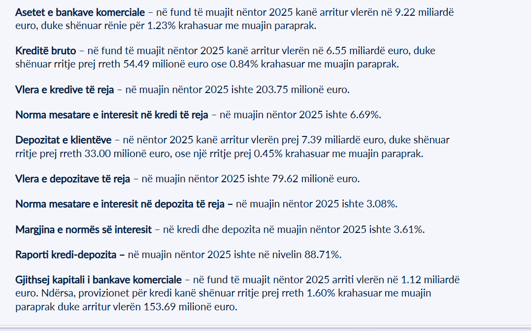 ‘’Depozitat e klientëve – në nëntor 2025 kanë arritur vlerën prej 7.39 miliardë euro, duke shënuar rritje prej rreth 33.00 milionë euro, ose një rritje prej 0.45% krahasuar me muajin paraprak, kurse vlera e depozitave të reja – në muajin nëntor 2025 ishte 79.62 milionë euro”.
