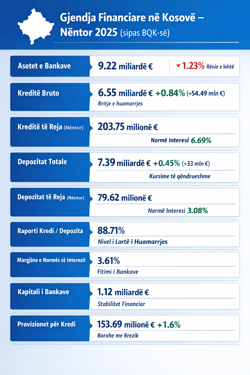 ‘’Gjithsej kapitali i bankave komerciale – në fund të muajit nëntor 2025 arriti vlerën në 1.12 miliardë euro. Ndërsa, provizionet për kredi kanë shënuar rritje prej rreth 1.60% krahasuar me muajin paraprak duke arritur vlerën 153.69 milionë euro’’, njofton Banka Qendrore e Republikës së Kosovës.