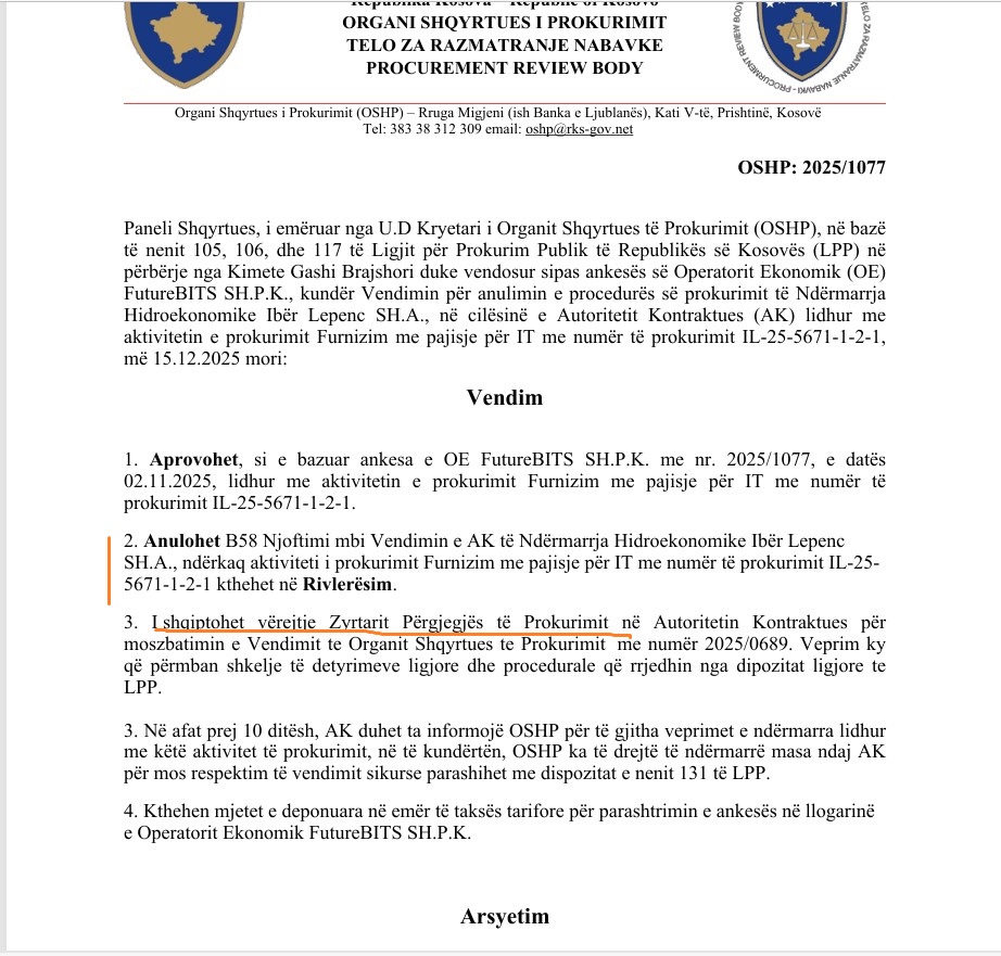 Paneli Shqyrtues i OSHP-së, i kryesuar nga Kimete Gashi, ka aprovuar si të bazuar ankesën e operatorit ekonomik FutureBITS SH.P.K., duke anuluar vendimin e Autoritetit Kontraktues për anulimin e tenderit dhe duke e kthyer aktivitetin në rivlerësim “Furnizim me pajisje për IT”