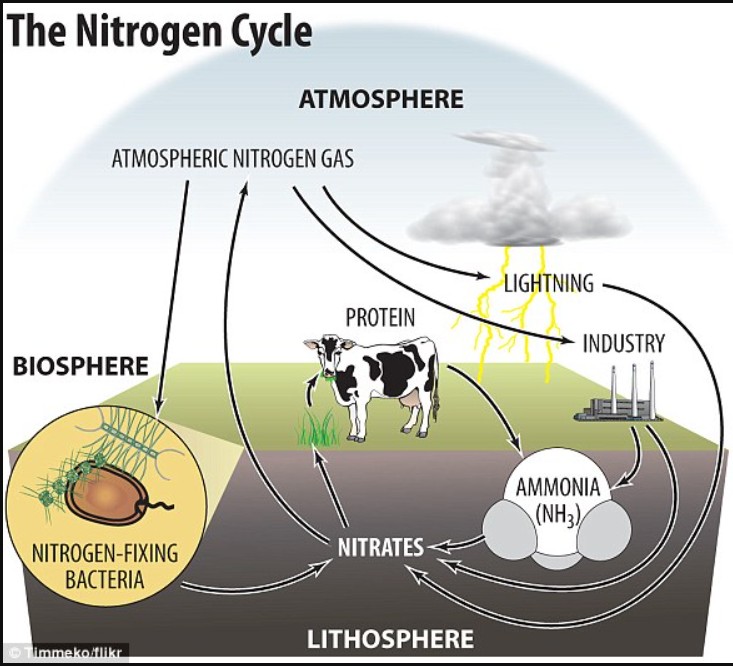Cikli i azotit përfshin transformimin e tij nga ajri në tokë dhe bimë, me ndihmën e organizmave fiksozë të azotit, rrufeve, dhe bakterieve që e konvertojnë në nitrate. Kur bima vdes ose hahet nga kafshët, azoti kthehet në tokë, duke mbyllur ciklin jetësor.