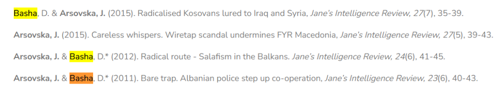 Katër punime i ka në bashkëautorësi, përkatësisht bashkëpronësi intelektuale, Dimal Basha, Kryetar i Kuvendit të Kosovës, me ‘studiuesen’ maqedonase, Jana Arsovska. CV-ja e kësaj të fundës në uebfaqen dhe profilin e saj zyrtar, me një CRTL-F (find) të shpejtë, të gjen katër rezultate, katër shkrime të dhëna për botën akademike të dyshes Arsovska & Basha. Maqedonasja është e specializuar në anti-shqiptarizëm që (nën)kuptohet nga vëllimi dhe fiksimi i saj me “kriminalitetin e shqiptarëve” (titulli i doktoraturës dhe veprës së saj më të arritur: Dekodimi i Krimit te Shqiptarët) e deri te një bibliografi e tërë me tema të ngjashme, për të gjetur apoteozën te portretimi i Ushtrisë Çlirimtare të Kosovës si formacion ushtarak i formuar, armatosr dhe mirëmbajtur nga “para të drogës”. Pyetja, më indinjuesa, që publiku kosovar ka shtruar, është çka ka kërkuar Dimal Basha të jetë bashkëudhëtar akademik me një studiuese namkeqe ndaj shqiptarëve. Basha u pati arsyetuar se ka kontribuar vetëm në një kapitull për islamin radikal, por edhe brenda punimit famëkeq anti-UÇK aty janë edhe dy referenca tjera “Arsovksa & Basha” të punimeve tjera bashkëautoriale.