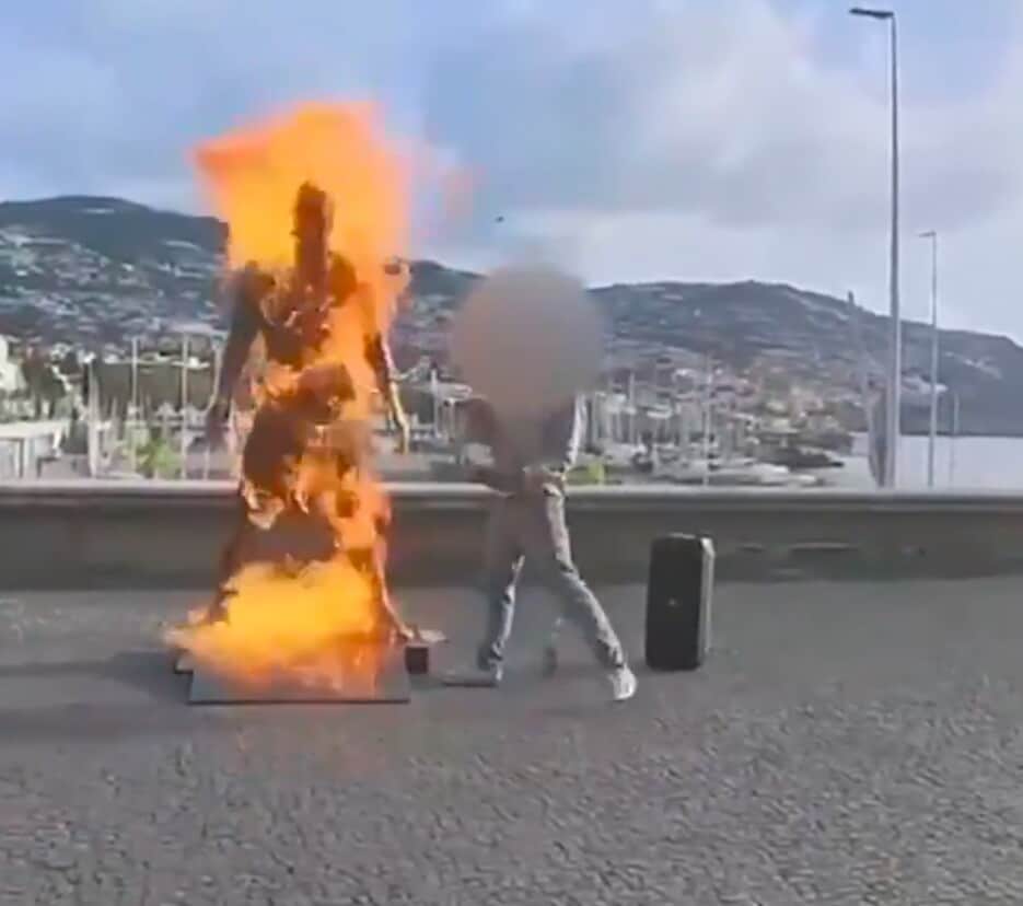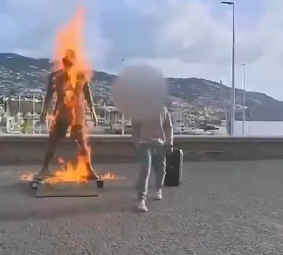 Në pamje shihet influenceri teksa hedh benzinë mbi statujë dhe ndez fitilin. Pas pak çastesh, zjarri u shua menjëherë, ndërsa ai vijoi të kërcente përballë monumentit të Ronaldos. Policia e Madeira ka bërë të ditur se i dyshuari është identifikuar, por ende nuk është arrestuar.