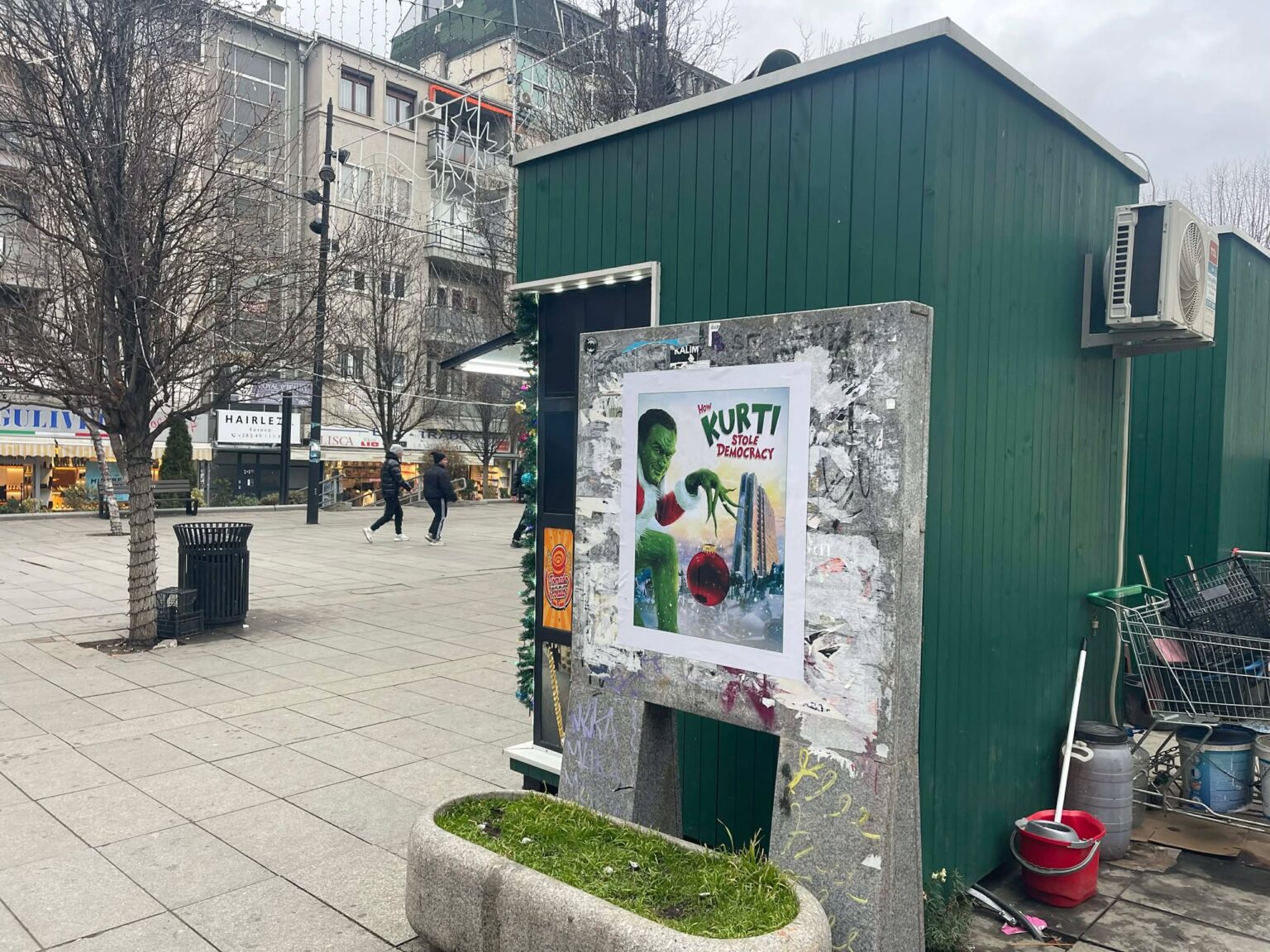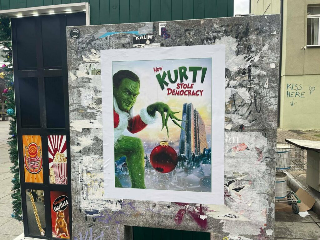 Kjo ndërhyrje artistike nga artisti “I am I” u bë në natën e Krishtlindjes si ironizim i figurës së Grinchit me Kurtin për zgjedhjet e parakohshme që do të mbahen më 28 dhjetor, raporton EO.