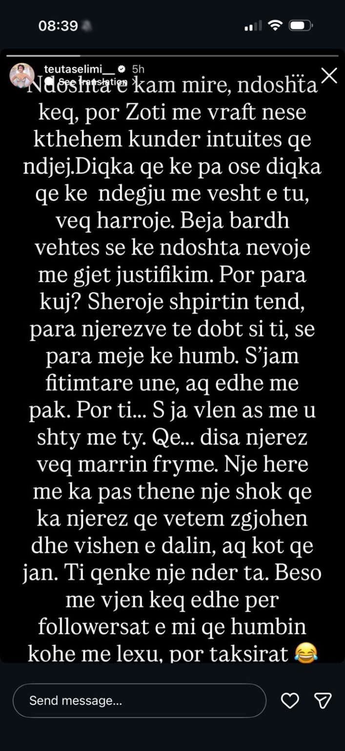Në fund të mesazhit, Teuta Selimi u kërkoi ndjesë ndjekësve të saj për ngarkesën emocionale të postimit, por e trajtoi situatën me një notë ironie duke e quajtur këtë një “taksirat” që duhej ndarë me publikun. Reagimi i saj ka nxitur menjëherë pyetje të shumta mes fansave, të cilët po pyesin se kujt i drejtoheshin këto fjalë kaq të rënda.