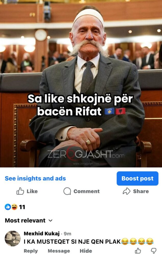 Në një postim në Facebook ku pasqyrohej fytyra e Rifat Jasharit, Mexhid Kukaj – simpatizant i LVV-së, ka ofenduar bacën Rifat.