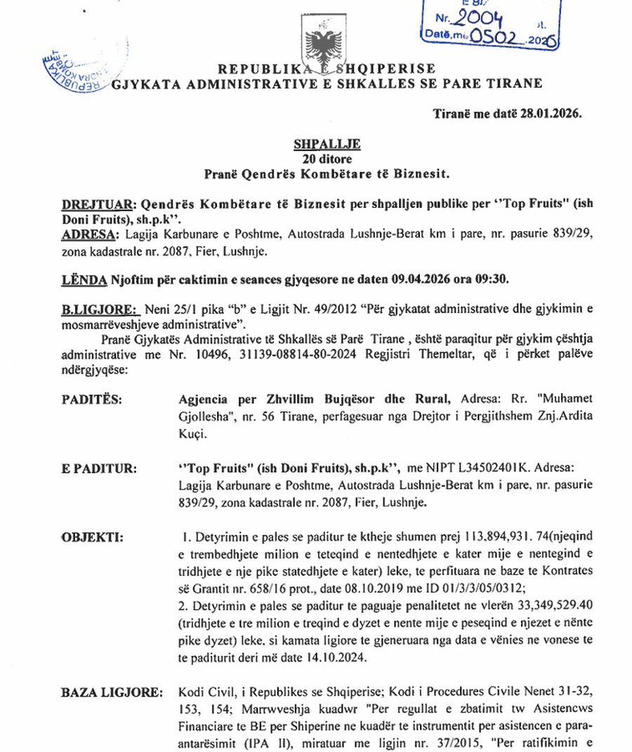 Portali Kapitali ka publikuar dokumentin e padisë, ku AZHBR i kërkon kompanisë më të madhe të grumbullimit të fruta perimeve në vend të kthejë shumën e grantit të përfituar në vitin 2019, së bashku me penalitetet përkatëse.