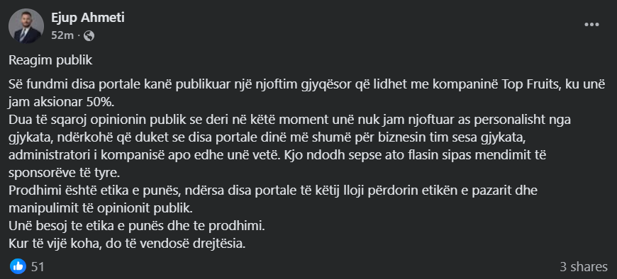 “Së fundmi disa portale kanë publikuar një njoftim gjyqësor që lidhet me kompaninë Top Fruits, ku unë jam aksionar 50%. Dua të sqaroj opinionin publik se deri në këtë moment unë nuk jam njoftuar as personalisht nga gjykata, ndërkohë që duket se disa portale dinë më shumë për biznesin tim sesa gjykata, administratori i kompanisë apo edhe unë vetë. Kjo ndodh sepse ato flasin sipas mendimit të sponsorëve të tyre”, ka pretenduar Ahmeti.“Prodhimi është etika e punës, ndërsa disa portale të këtij lloji përdorin etikën e pazarit dhe manipulimit të opinionit publik. Unë besoj te etika e punës dhe te prodhimi. Kur të vijë koha, do të vendosë drejtësia”, ka thënë Ahmeti.