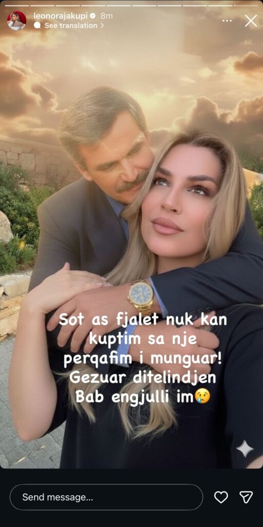 Përmes një fotografie të modifikuar me inteligjencë artificiale ku shfaqet pranë portretit të babait të saj, Leonora ka zgjedhur fjalë që drithërojnë për të kujtuar ditën e tij të lindjes.
