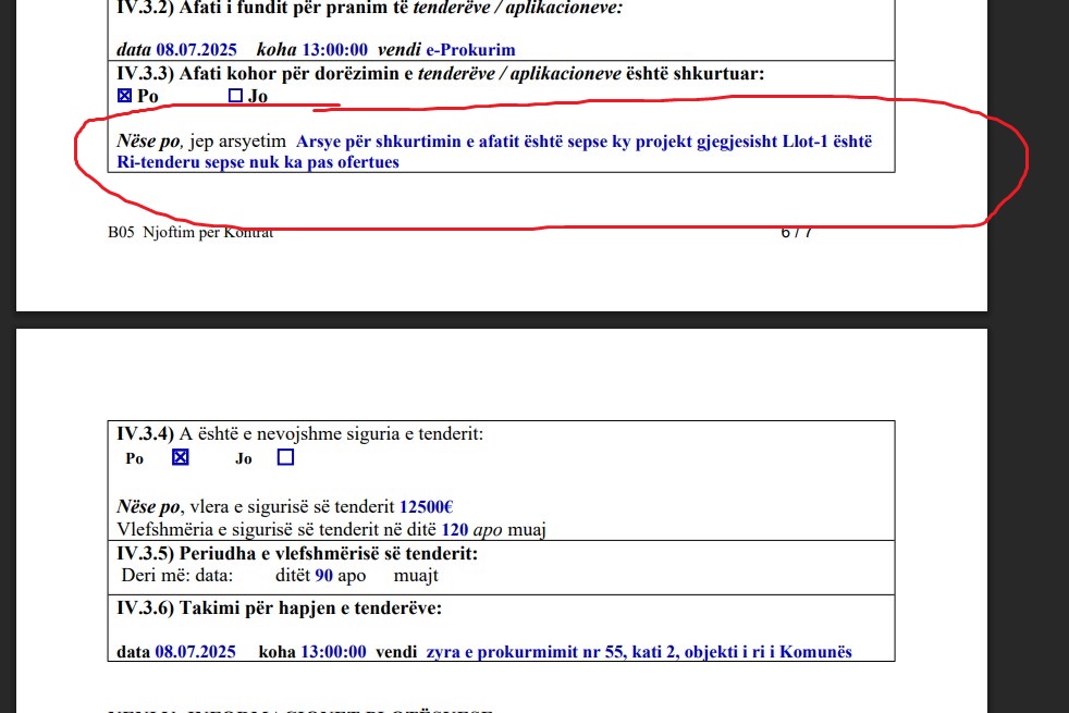 Në fund, mbetet të theksohet se edhe afati ligjor për paraqitjen e ofertave ka ngritur dyhsime. Sipas Ligjit për Prokurim Publik, për tenderët e mëdhenj afati minimal i hapur për ofertim duhet të jetë së paku 40 ditë, në mënyrë që të sigurohet konkurrencë e mjaftueshme dhe mundësi e barabartë pjesëmarrjeje për operatorët ekonomikë. Në këtë rast, dokumentet tregojnë se tenderi është hapur më 18 qershor dhe është mbyllur më 08 korrik 2025, duke e lënë periudhën efektive të aplikimit rreth 20 ditë, pra gjysmën e afatit të kërkuar me ligj.