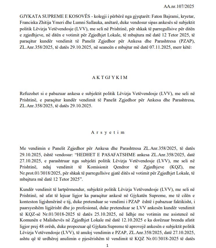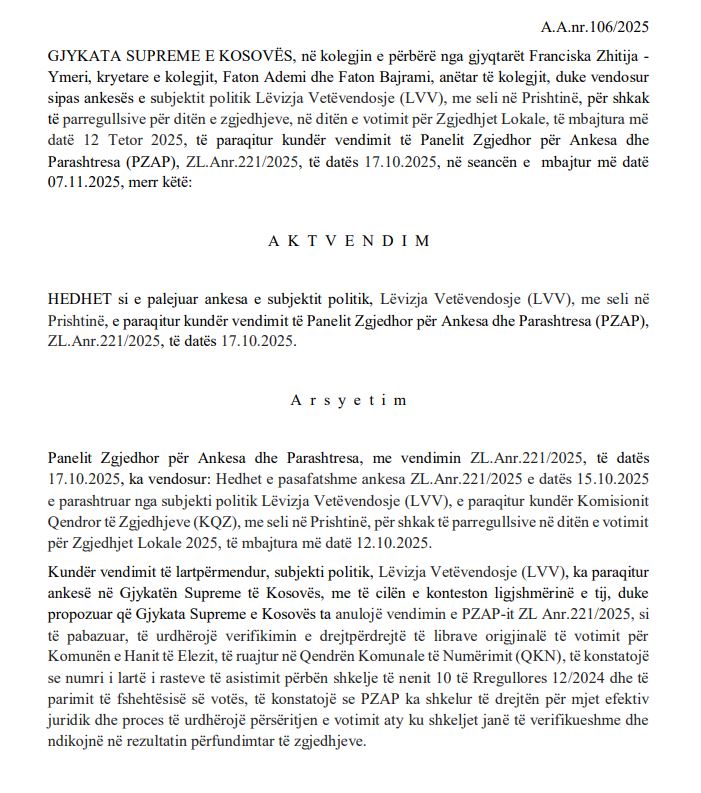 Në rastin e parë, kolegji gjyqësor e ka hedhur si të palejuar ankesën e paraqitur nga Lëvizja Vetëvendosje, kundër vendimit të Panelit Zgjedhor për Ankesa dhe Parashtresa të datës 17 tetor 2025, duke konstatuar se për të njëjtën çështje tashmë është vendosur nga kjo gjykatë me aktgjykimin e datës 23 tetor 2025, si dhe se për faktin se ankesa ishte parashtruar pas afatit të përcaktuar ligjor, transmeton Klankosova.tv.