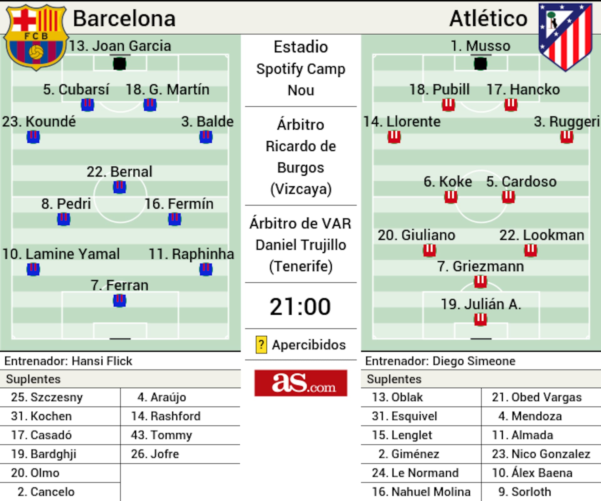 Në mesfushë do të startojnë Marc Bernal, Pedri dhe Fermín López, ndërsa dyshimi i tretë është sulmuesi qendror. Lamine Yamal dhe Raphinha do të jenë në krahë, por Flick mund të vendosë Dani Olmo si ‘9’ fals, ose të mbajë Ferran Torres si referencën kryesore ofensive, i cili është pa gol në 6 ndeshjet e fundit.