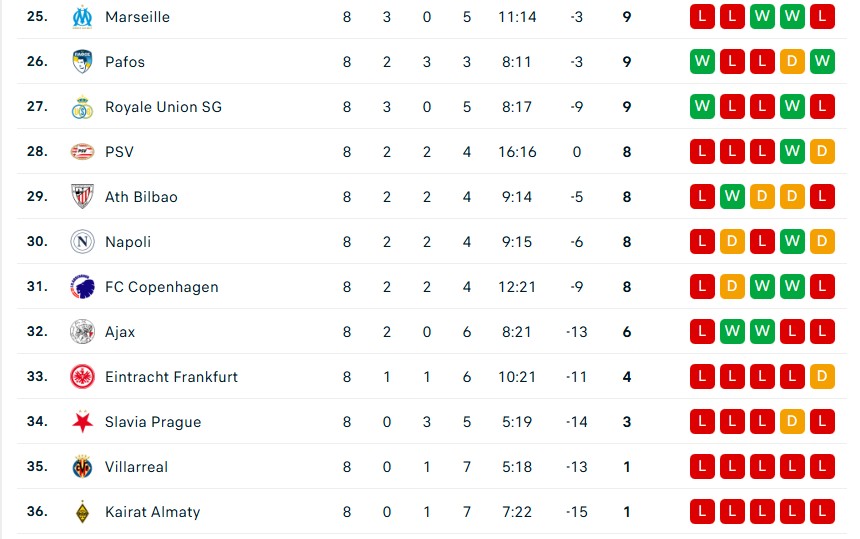 Ekipet e renditura nga vendi i 25-të në vendin e 36-të e mbyllin këtu aventurën në Champions League për këtë sezon, ku bien në sy ekipe si Napoli, Marseille dhe Athletic Bilbao.