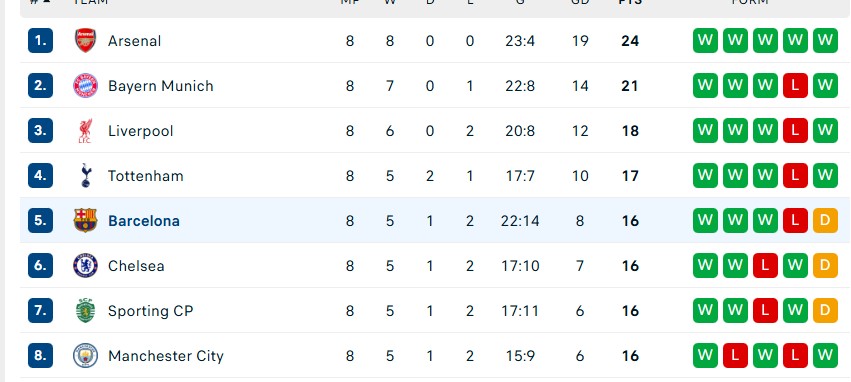 Janë luajtur sot ndeshjet e raundit të tetë dhe të fundit për këtë fazë në Champions League. Pas 8 raundesh, kemi 8 ekipet e renditura të parat, të cilat kualifikohen direkt për fazën e 1/16-ve, që është me eliminim.