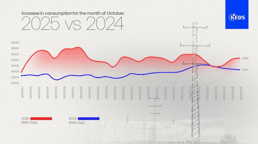 Siç bën të ditur në një njoftim, KEDS-i, vetëm nga 1 deri më 27 tetor, në Kosovë janë konsumuar rreth 429 milionë kWh energji elektrike, krahasuar me 362 milionë kWh të regjistruara gjatë të njëjtës periudhë një vit më parë. Kjo nënkupton një rritje prej rreth 18.5 për qind të kërkesës për energji.
