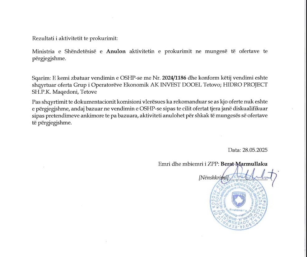 Bazuar në të dhënat e E-prokurimit më 21 nëntor 2024, Ministria ka publikuar Njoftimin për Vendimin B58 për anulimin e aktivitetit të prokurimit, duke konstatuar se asnjë kompani nuk përmbush kriteret.