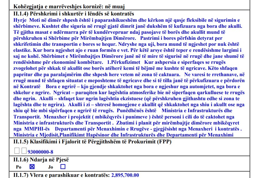 Në përshkrim, ministria argumenton se mirëmbajtja dimërore kërkon fleksibilitet dhe se bora është faktor që: “shfaqet papritur dhe pa paralajmërim…”