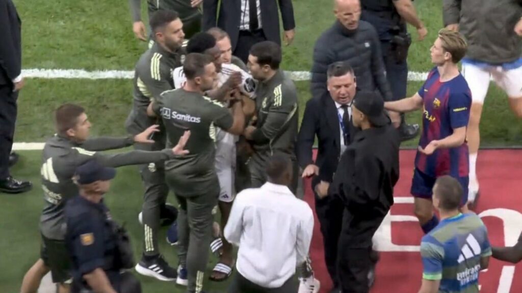 Lojtarë nga të dyja skuadrat ndërhynë për t’i ndarë, por tensioni u rrit edhe më shumë kur Yamal u përplas verbalisht me Vinicius Junior.