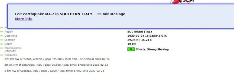 Para pak minutash një tërmet i fortë me magnitudë 4.7 i shkallës rihter ka prekur Kosenzan.