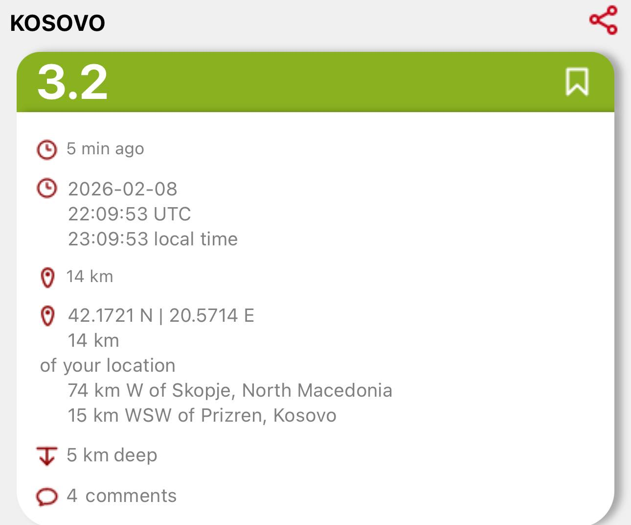 Një tërmet me magnitudë 3.2 ballë ka goditur Kosovën mbrëmjen e së dielës, rreth orës 23:09 sipas kohës lokale.