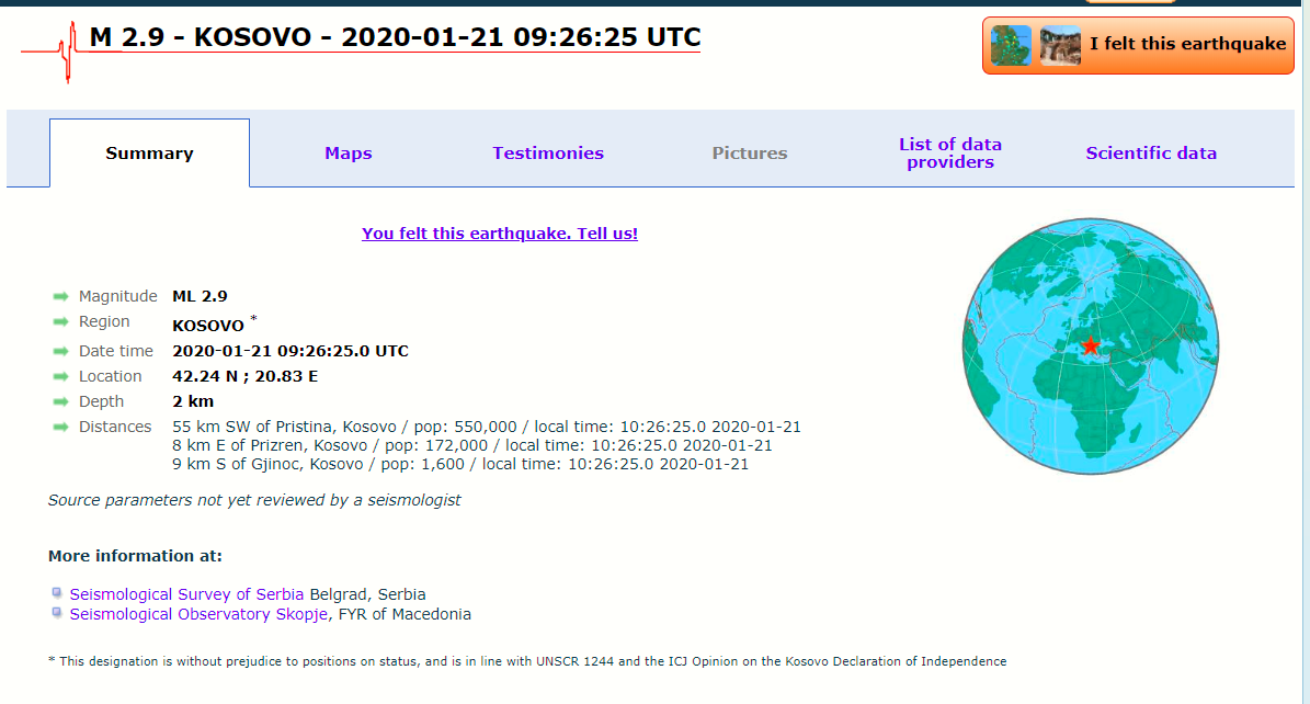 Në uebfaqen EMSC që regjistron tërmetet, bëhet e ditur se në fshatin Gjinoc të Suharekës ka qenë epiqendra dhe se fuqia e tij ka qenë me magnitudë prej 2.9 shkallë të Rihterit dhe thellësia ka qenë prej 2 kilometra.