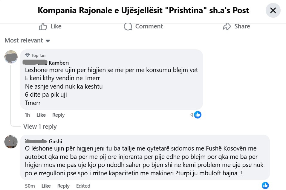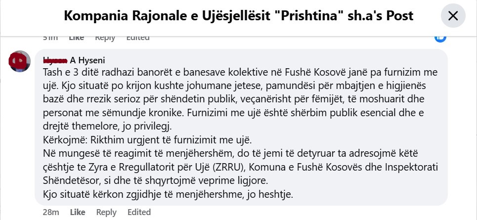 Njoftimi i KRU “Prishtina” në rrjetin social Facebook për mungesën e ujit në Fushë Kosovë është shndërruar në një mur ankesash e shpërthimesh qytetare, ku komentet e mbushura me zemërim, sharje dhe akuza pasqyrojnë revoltën e thellë ndaj një situate që, sipas tyre, ka kaluar çdo kufi durimi. /Demokracia.com/
