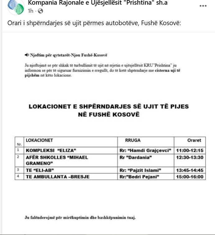 Në mungesë të furnizimit të rregullt, Komuna dhe KRU Prishtina kanë nisur shpërndarjen e ujit të pijes me cisterna, por vetëm në pika të vogla dhe me orare të kufizuara, çka qytetarët e konsiderojnë të pamjaftueshme dhe diskriminuese.