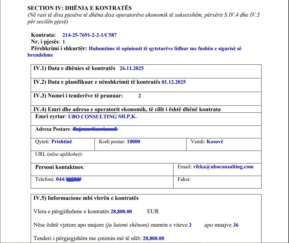 Megjithatë, vetëm pak ditë nga këto sulme, Ministria e Punëve të Brendshme, e udhëhequr nga Xhelal Sveçla, një nga figurat më të afërta të Albin Kurtit, ka futur UBO Consulting si fituese të tenderit të radhës për matje të opinionit në fushën e sigurisë së brendshme. Kontrata do të nënshkruhet më 1 dhjetor, vlera e saj është 28,800 euro, ndërsa kohëzgjatja 36 muaj.