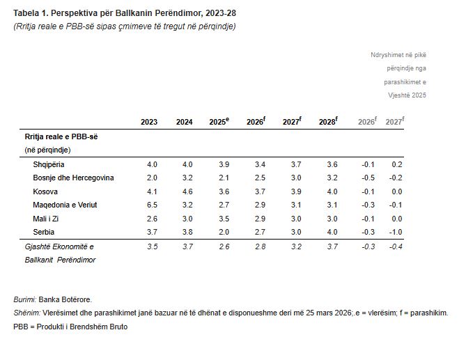 Raporti i Rregullt Ekonomik për Ballkanin Perëndimor parashikon se rritja e kombinuar ekonomike e Shqipërisë, Bosnjë dhe Hercegovinës, Kosovës, Malit të Zi, Maqedonisë së Veriut dhe Serbisë do të arrijë në 2.8% në vitin 2026, që është 0.3 pikë përqindje më e ulët krahasuar me parashikimet e mëparshme. Rritja ekonomike pritet të përshpejtohet në mënyrë modeste në 3.2% në vitin 2027.