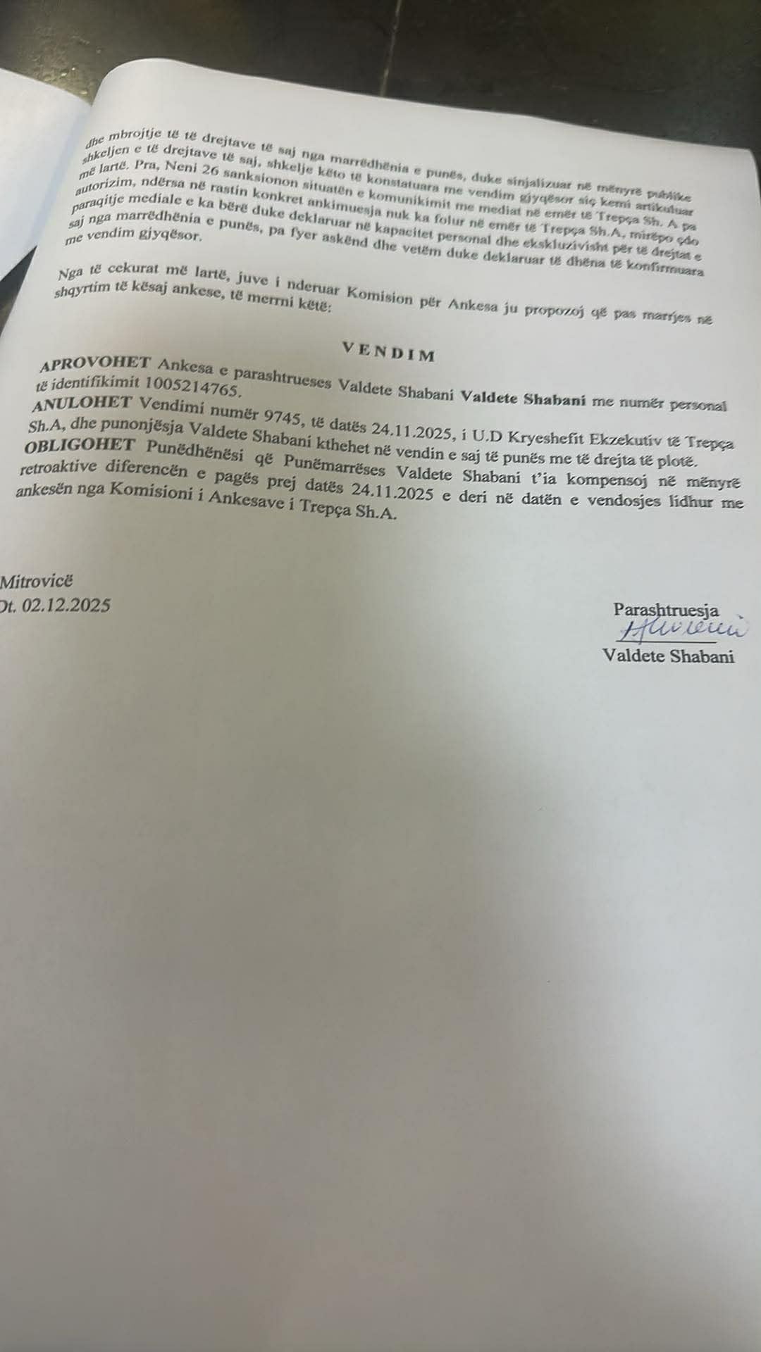 Valdete Shabanit katër herë i është ndryshuar vendi i punës në Ndërmarrjen “Trepça” brenda një viti e gjysmë.