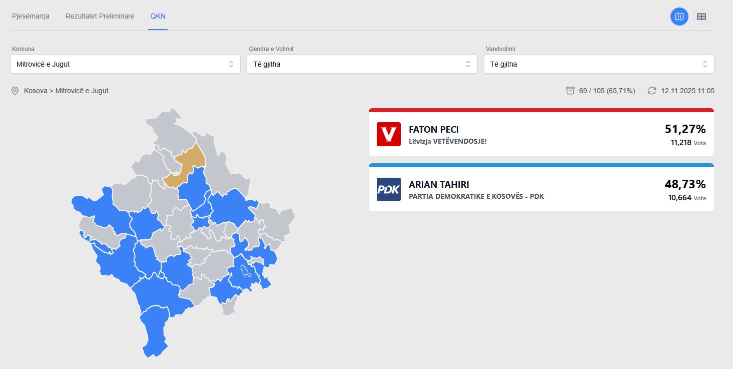 Deri më tani janë procesuar 69 vendvotime, që kanë rezultuar me këto të dhëna: Peci (51,27%) dhe Tahiri (48,73%)