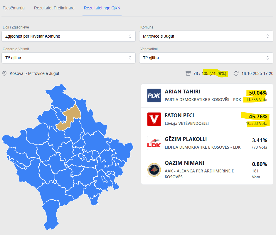 Votimet në Qendra Komunale të Numërimit janë duke vijuar numërimit, ndërsa në 75% të vendvotimeve në Mitrovicë të verifikuara, Arian Tahiri i Partisë Demokratike të Ksovës prin ndja Faton Pecit të Vetëvendosjes me rreth 5% deri më tash.
