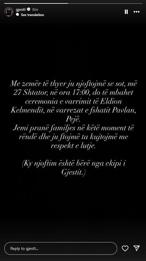 “Me zemër të thyer ju njoftojmë se sot, më 27 shtator, në ora 17:00, do të mbahet ceremonia e varrimit të Eldion Kelmendit, në varrezat e fshatit Pavlan, Pejë. Jemi pranë familjes në këtë moment të rëndë dhe ju ftojmë ta kujtojmë me respekt e lutje. (Ky njoftim është bërë nga ekipi i Gjestit)”, thuhet në reagimin e publikuar në Instagram.