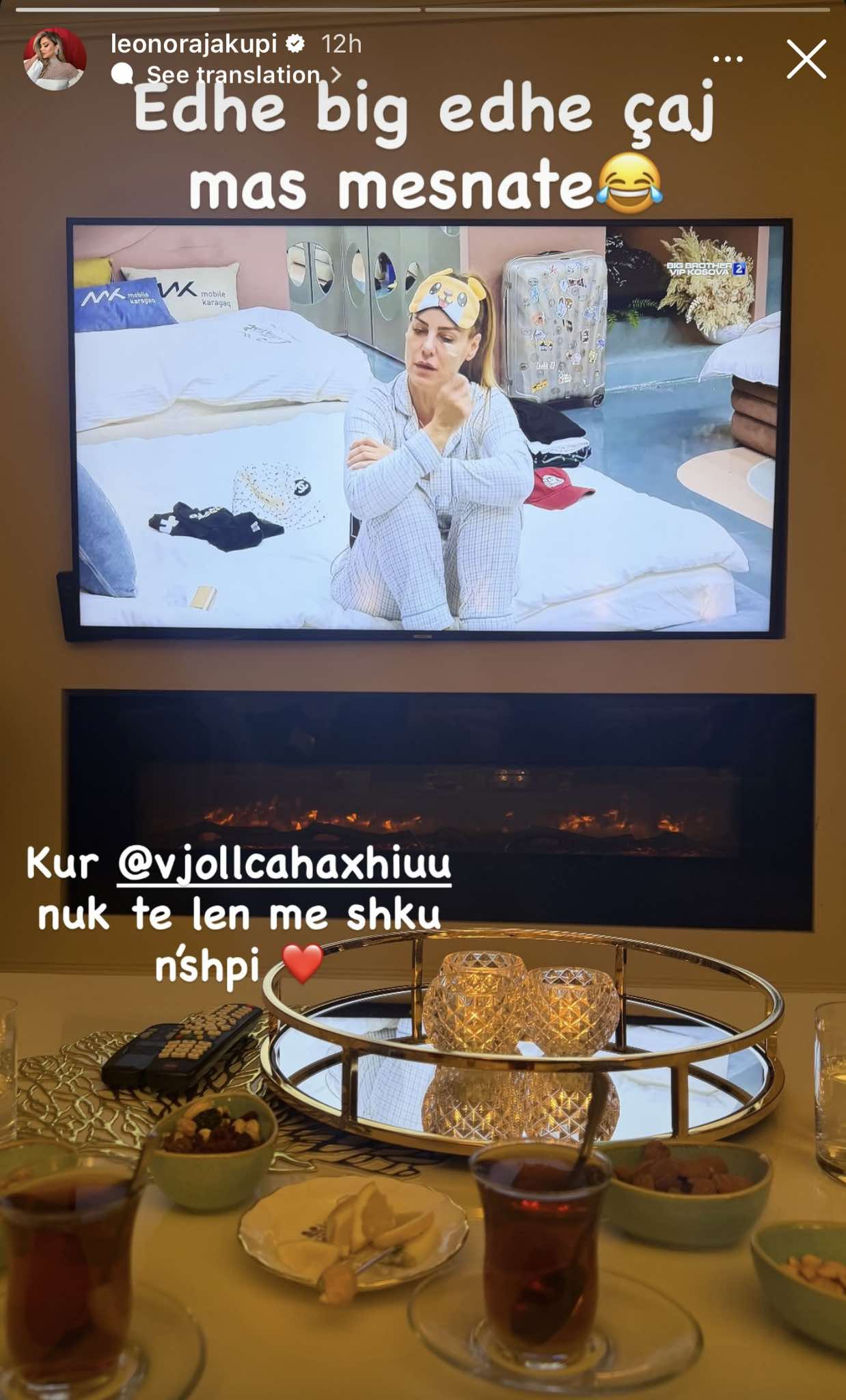 Përmes një Instastory, Leonora ka treguar se ka qenë për vizitë në shtëpinë e Vjollcës, ku kanë kaluar kohë së bashku duke pirë çaj dhe duke ndjekur spektaklin “Big Brother VIP Kosova”, ku ajo është pjesë si opinioniste.