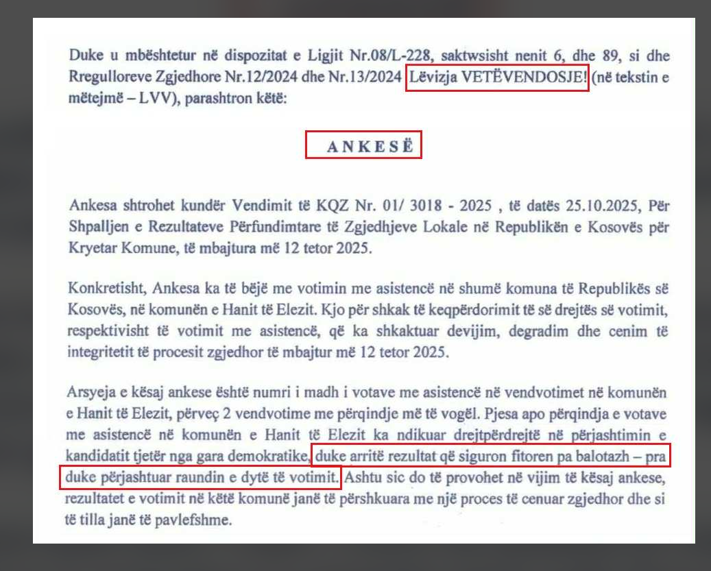 Lëvizja Vetëvendosje ka bërë një huqje të madhe në ankesën e saj dërguar në PZAP, ku konteston fitoren e kandidati të PDK-së për kryetar të Hanit të Elezit, Mehmet Ballazhi.