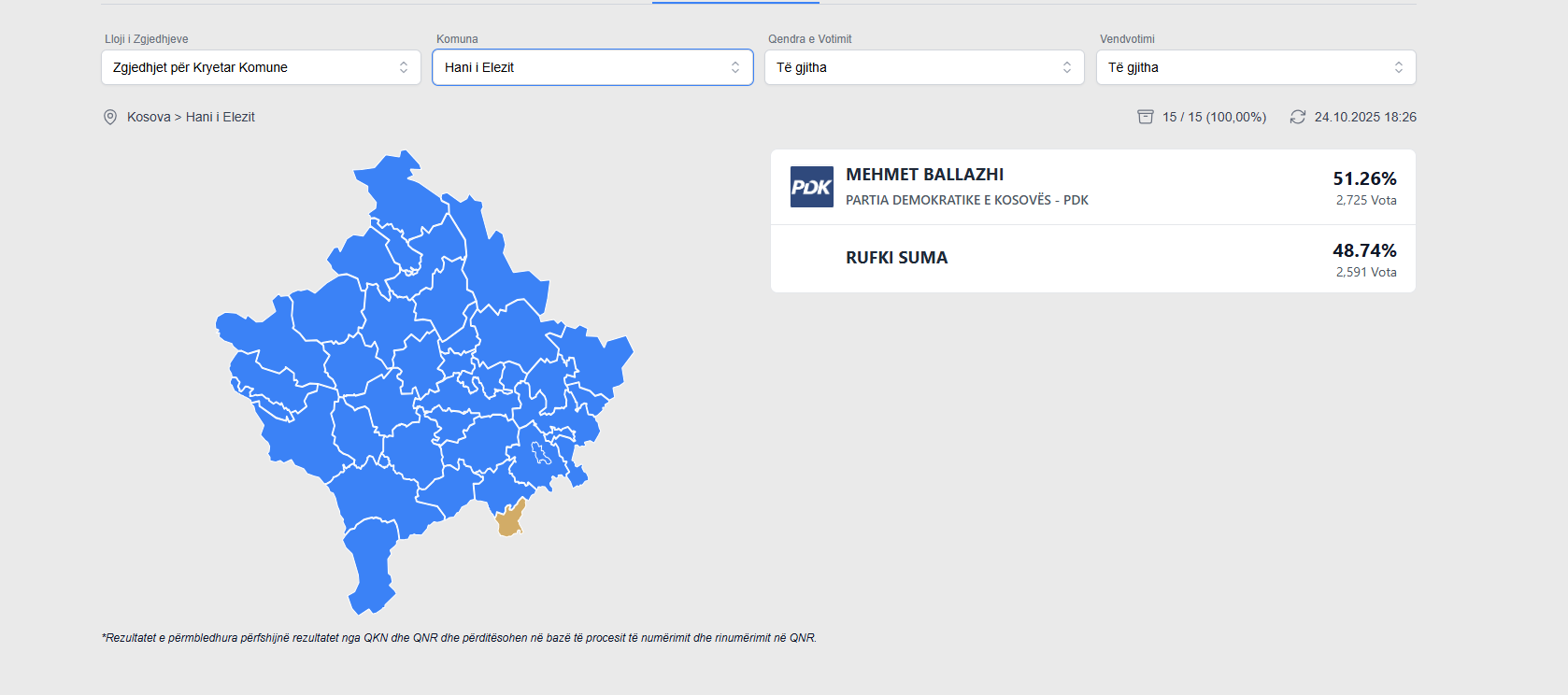 Ndonëse më 12 tetor në garë për kryetar të kësaj komune ishin vetëm dy kandidatë, Mehmet Ballazhi i PDK-së dhe Rufksi Suma kandidat i pavarur, Lëvizja Vetëvendosje kishte pritur që të ketë raund të dytë të votimit në këtë garë.