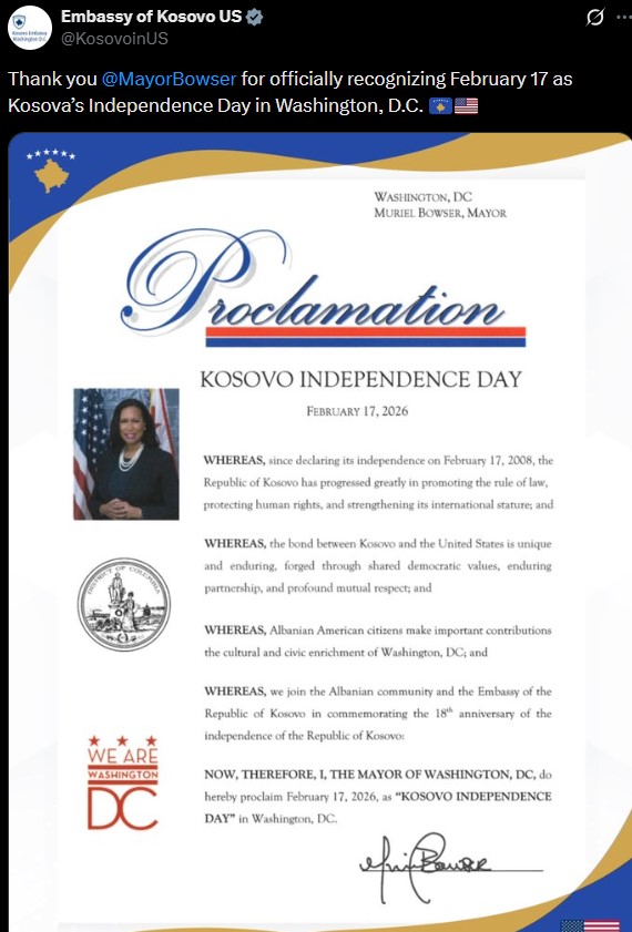 “Faleminderit kryetarja Bowser që njohët zyrtarisht 17 shkurtin si Ditën e Pavarësisë së Kosovës në Uashington, D.C.”, thuhet në reagimin e Ambasadës.