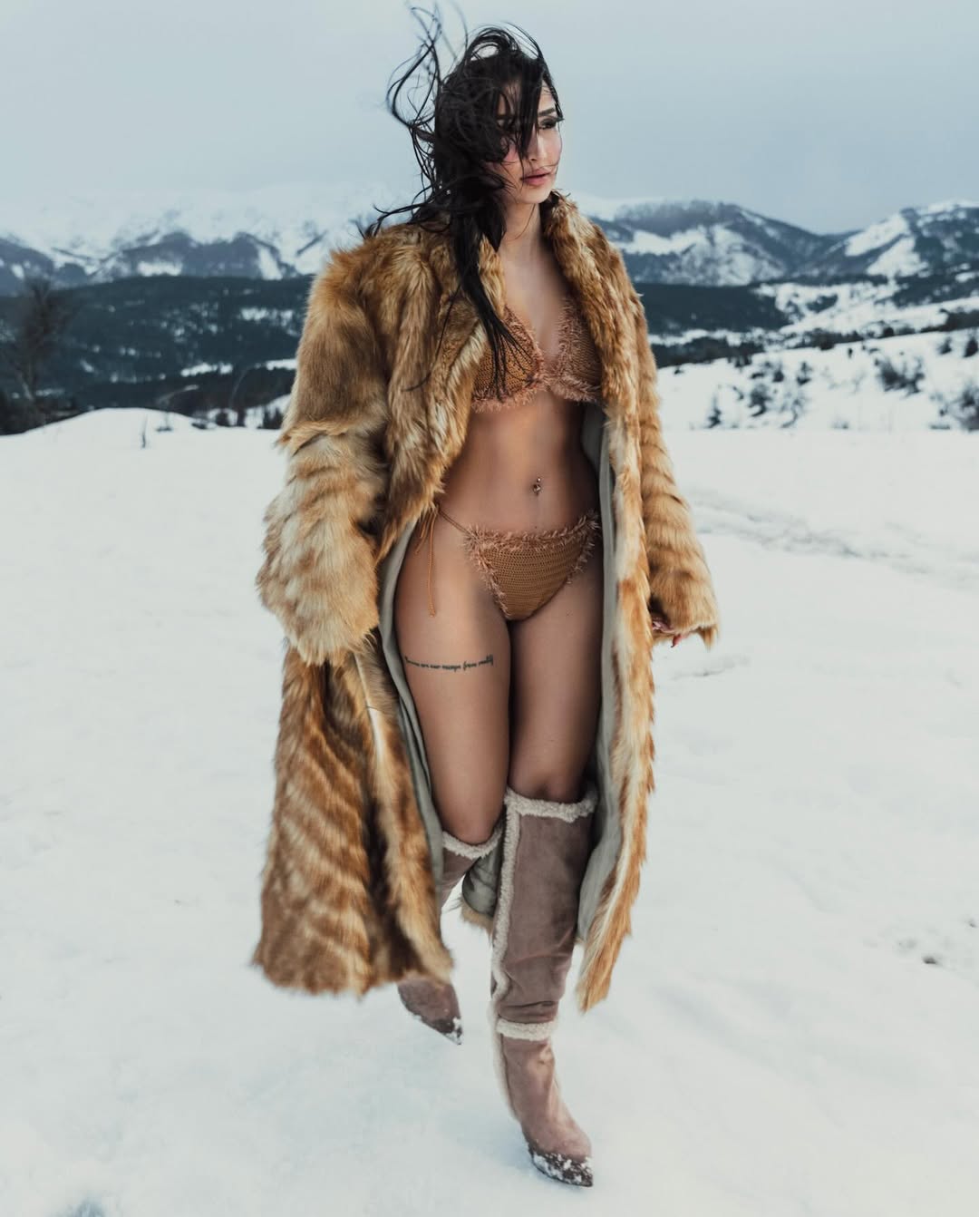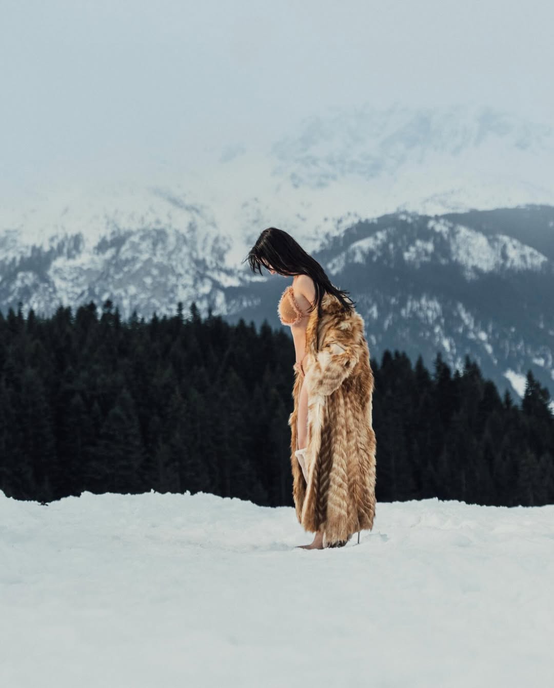 Fotografitë i ka realizuar në një zonë malore të mbuluar me borë, ku shihet e zhveshur në bikini.