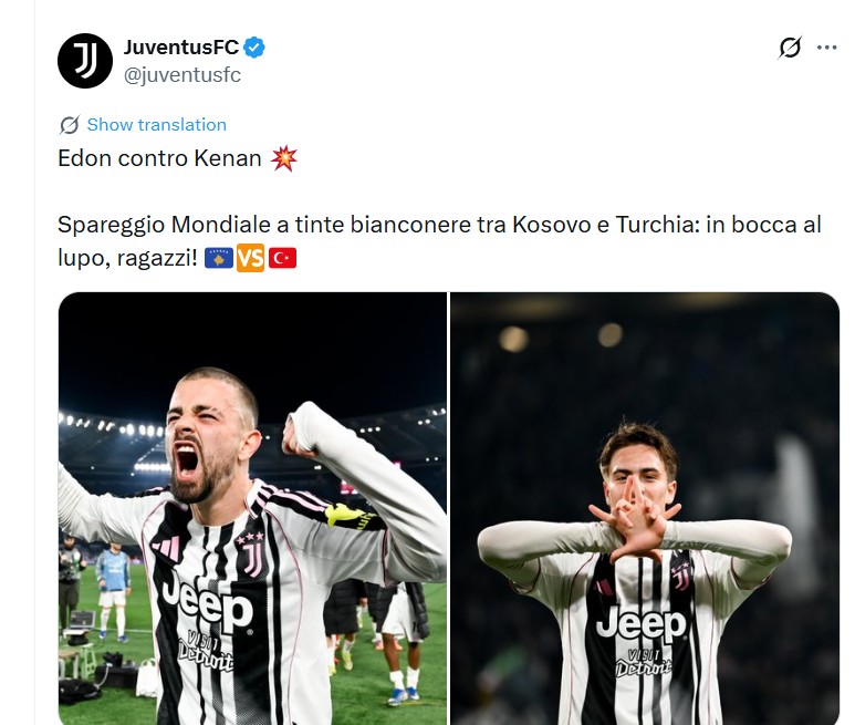 Kosova dhe Turqia do të përballen sonte në “Fadil Vokrri”, në finalen e madhe për një biletë për në Kupën e Botës 2026. Duke qenë se në fushë do jenë dy nga yjet e Juventusit, por këtë herë si kundërshtarë, Kenan Yildiz dhe Edon Zhegrova, klubi bardhezi ka reaguar përmes një mesazhi në rrjetet sociale, për të dy lojtarët.