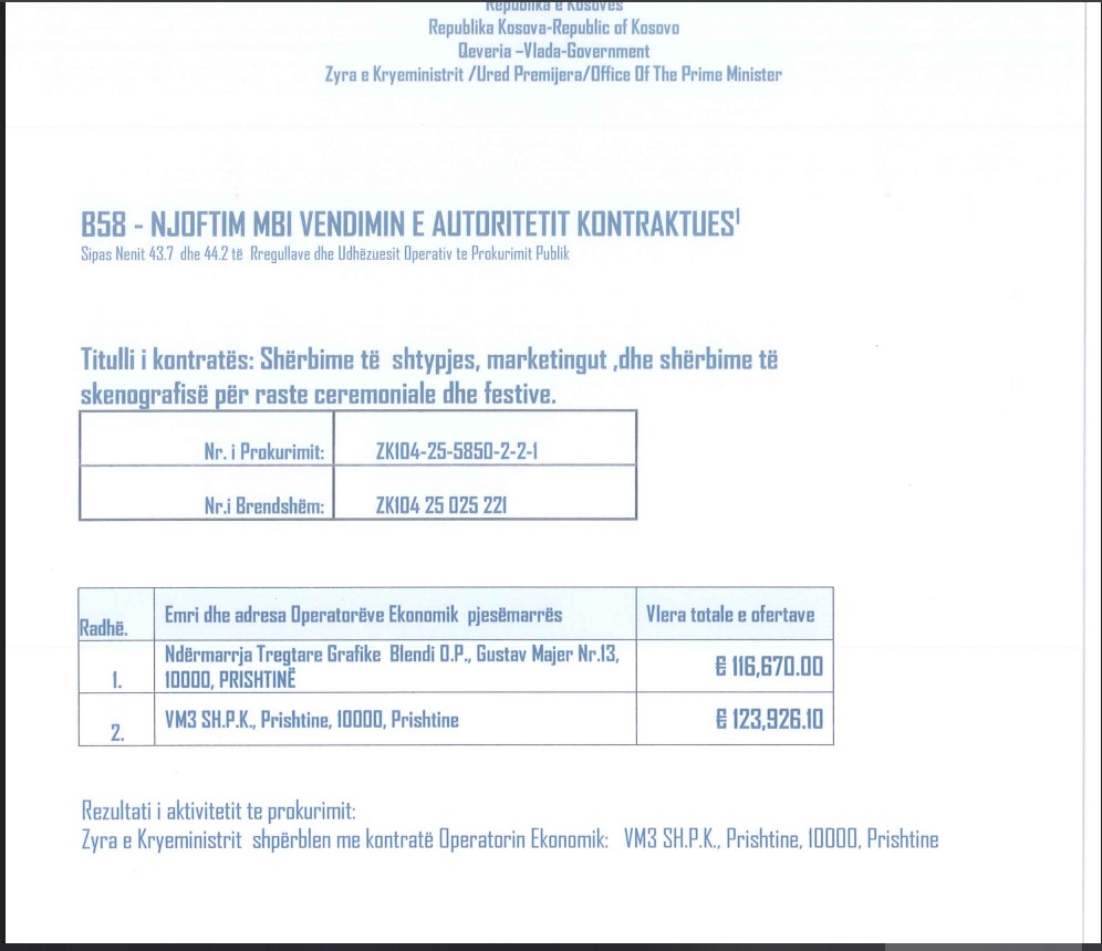 Zyra e Kryeministrit në detyrë, Albin Kurti, ka realizuar një tender me vlerë mbi 120 mijë euro për shërbime të marketingut, shtypjes dhe skenografisë për raste ceremoniale dhe festive, shkruan Demorkacia.com.